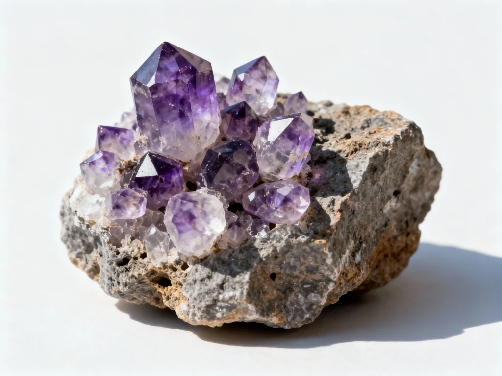 A Ametista é uma variedade violeta do quartzo, cuja tonalidade resulta da presença de ferro e da exposição natural à radiação durante milhões de anos. As suas cores podem variar desde lilás suave até violeta profundo, passando por combinações únicas em geodos e drusas.